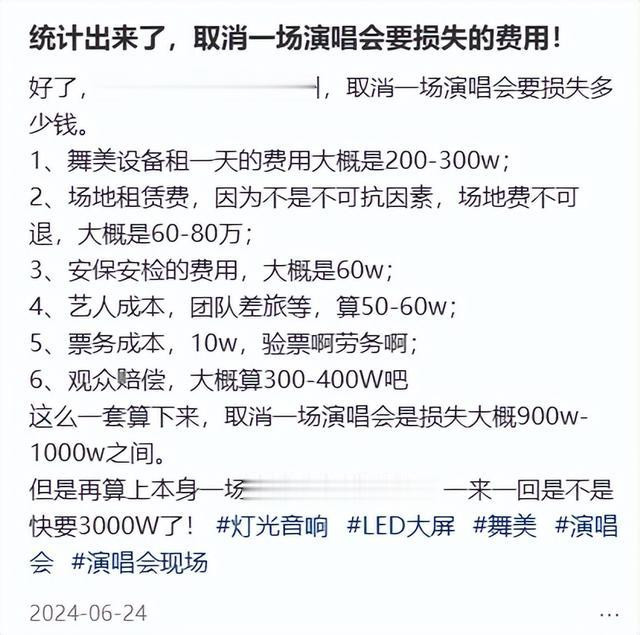 现在连着取消三场已经官宣的演唱会,造成的损失,想想就知道小不了。
